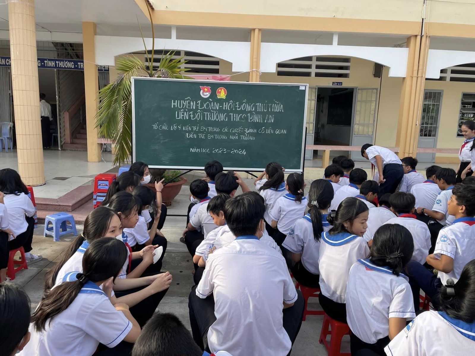 Liên đội trường THCS Bình An đã tổ chức buổi lấy ý kiến của học sinh về các quyết định có liên quan đến trẻ em trong nhà trường. Sự kiện có sự tham gia của hơn 300 học sinh đại diện cho 13 chi đội, với 13 ý kiến đóng góp được ghi nhận để cải thiện và tổ chức các hoạt động dành cho học sinh.